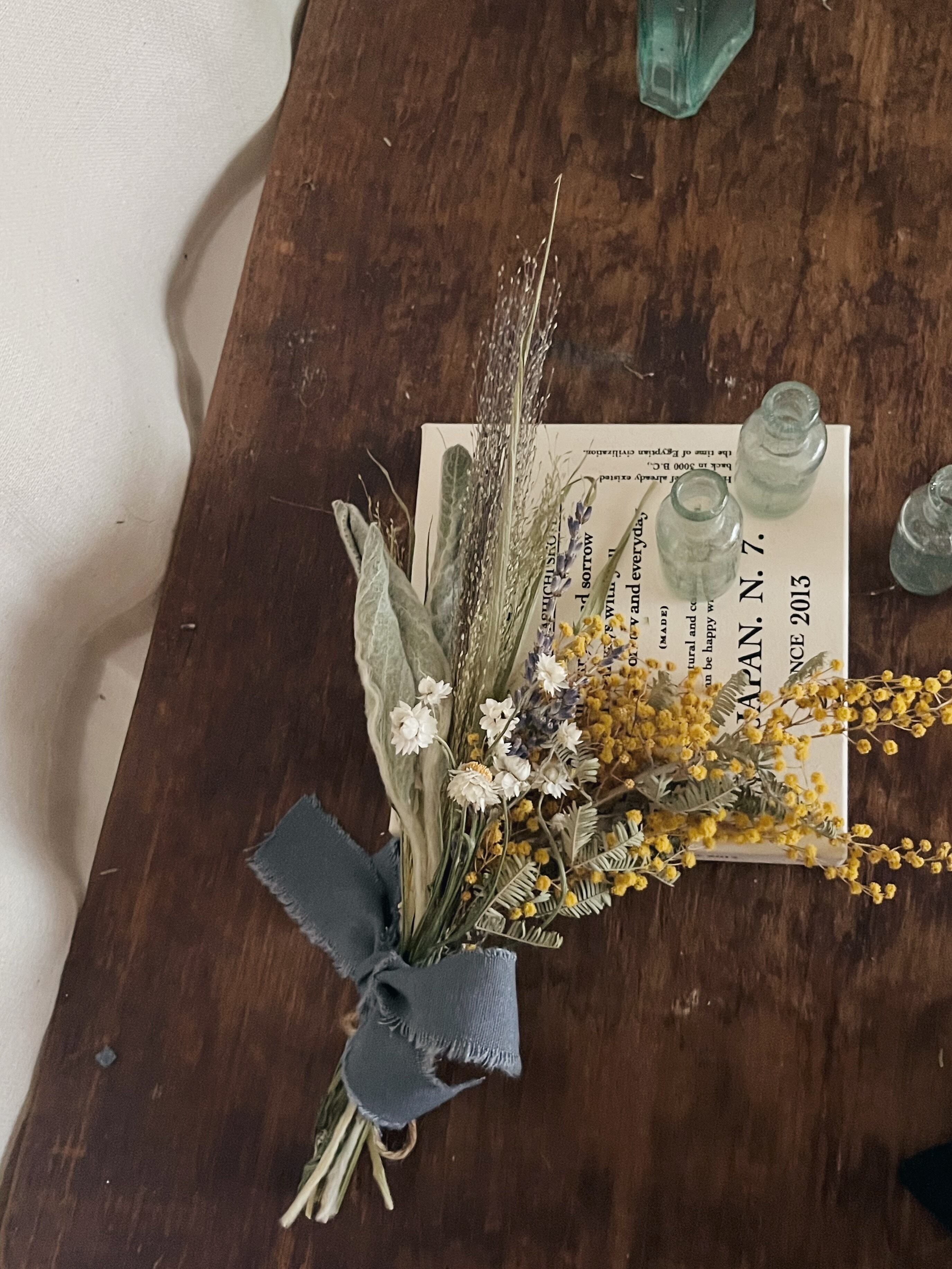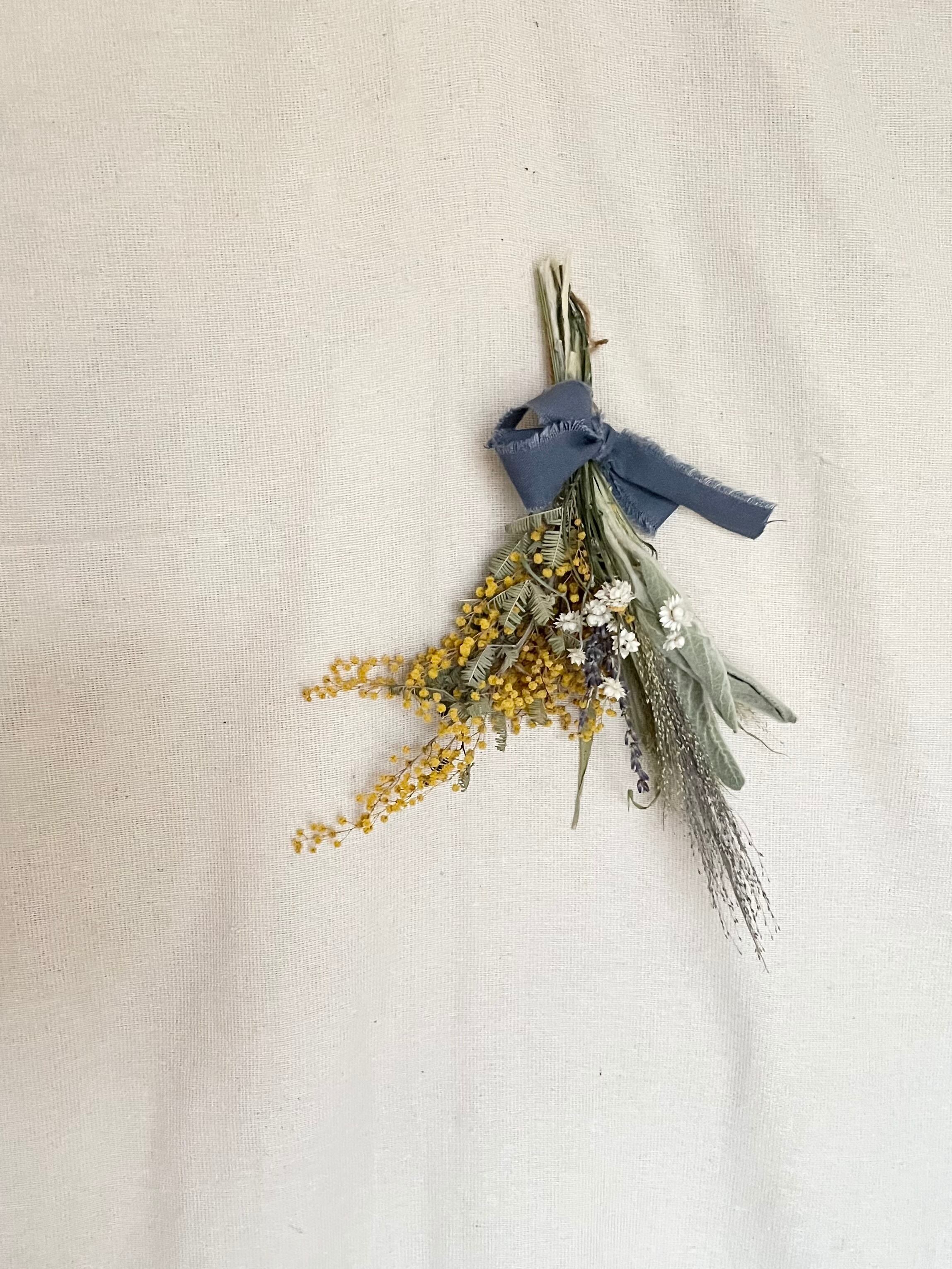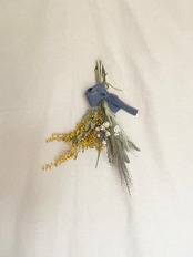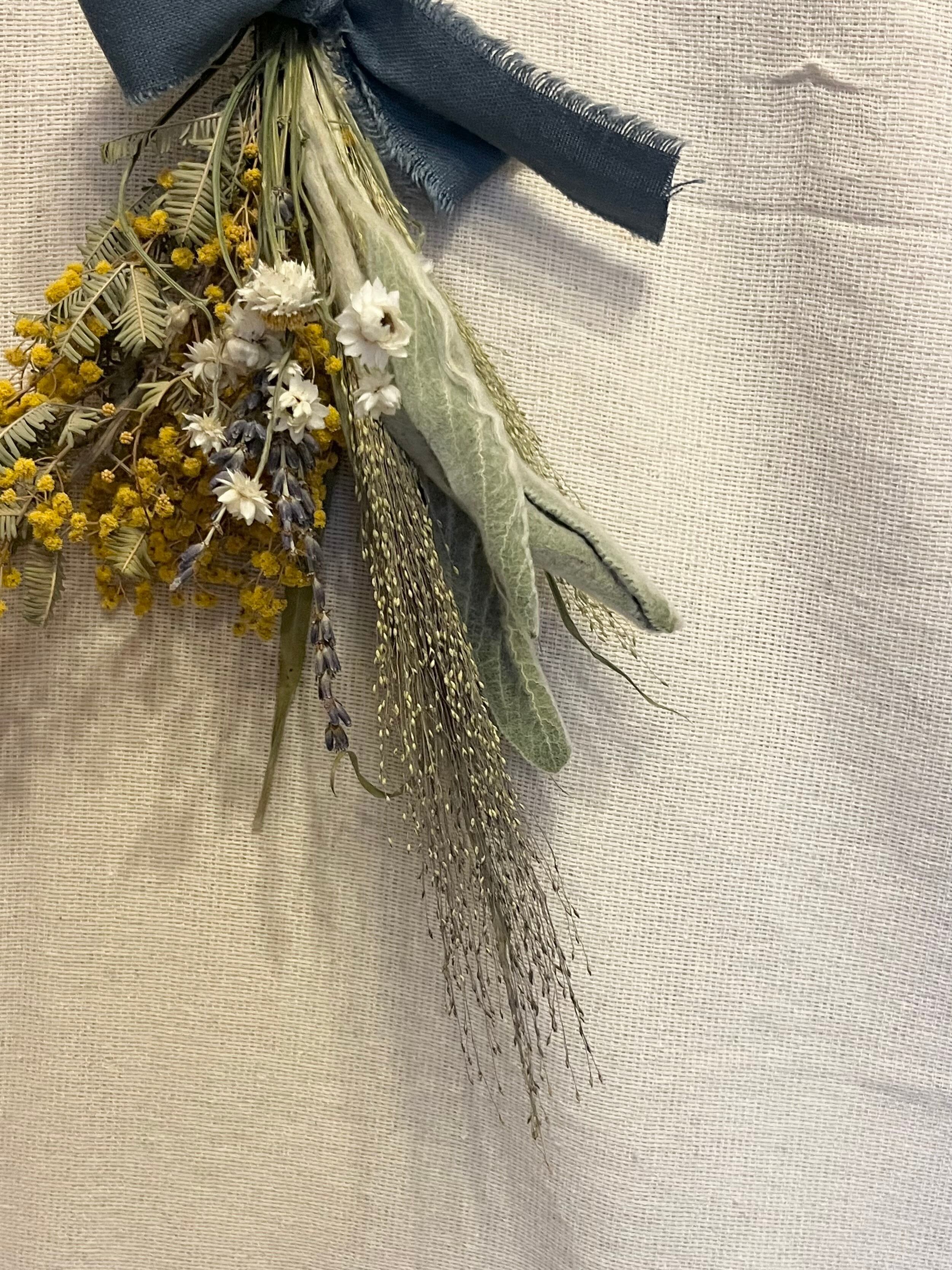 「ヤギの耳」と呼ばれる、ふわふわのラムズイヤーや、ラベンダー、スモークグラスなど、ナチュラルでやわらかな印象のドライフラワーとさわやかなブルーのリボンを合わせました。