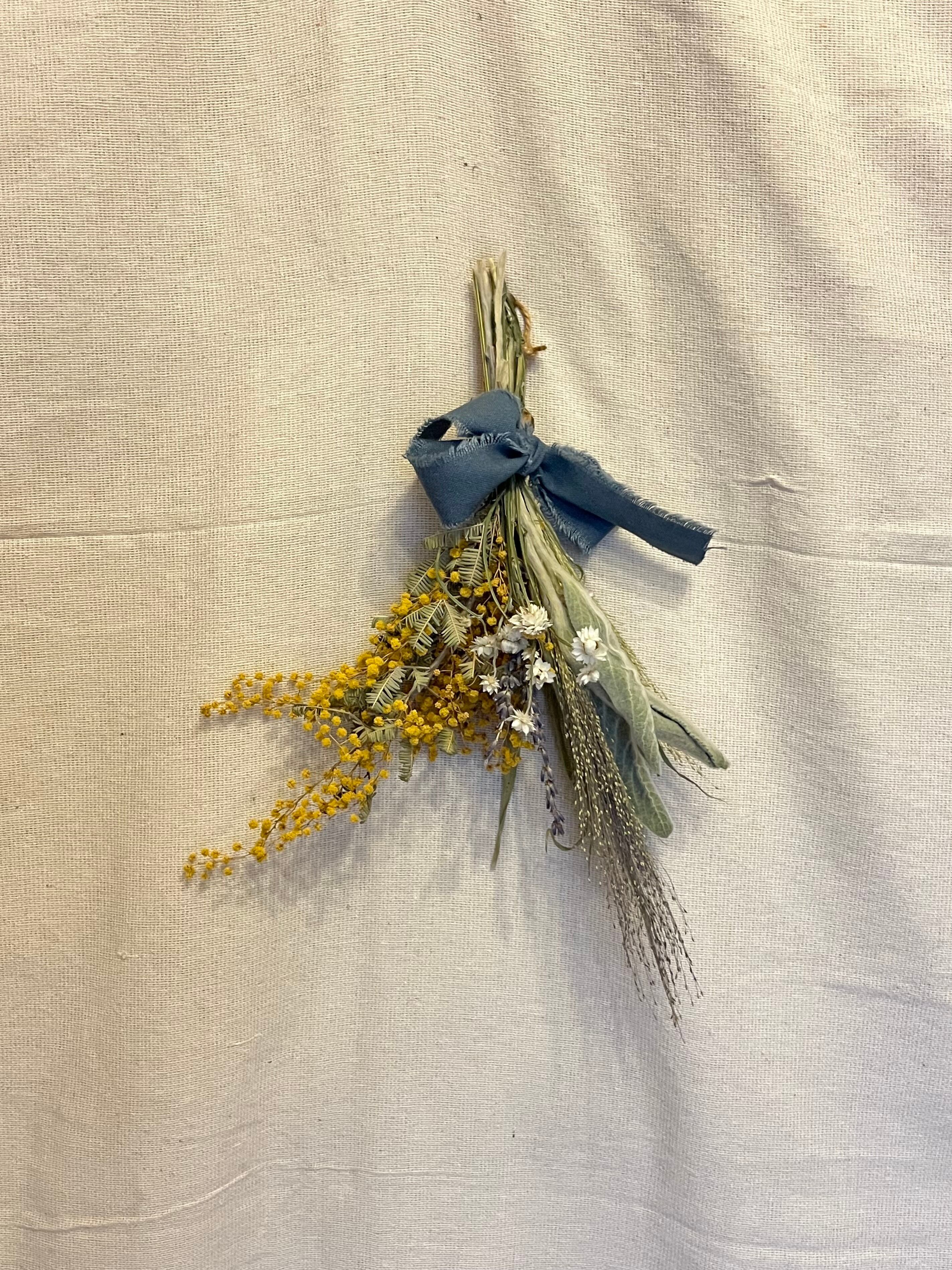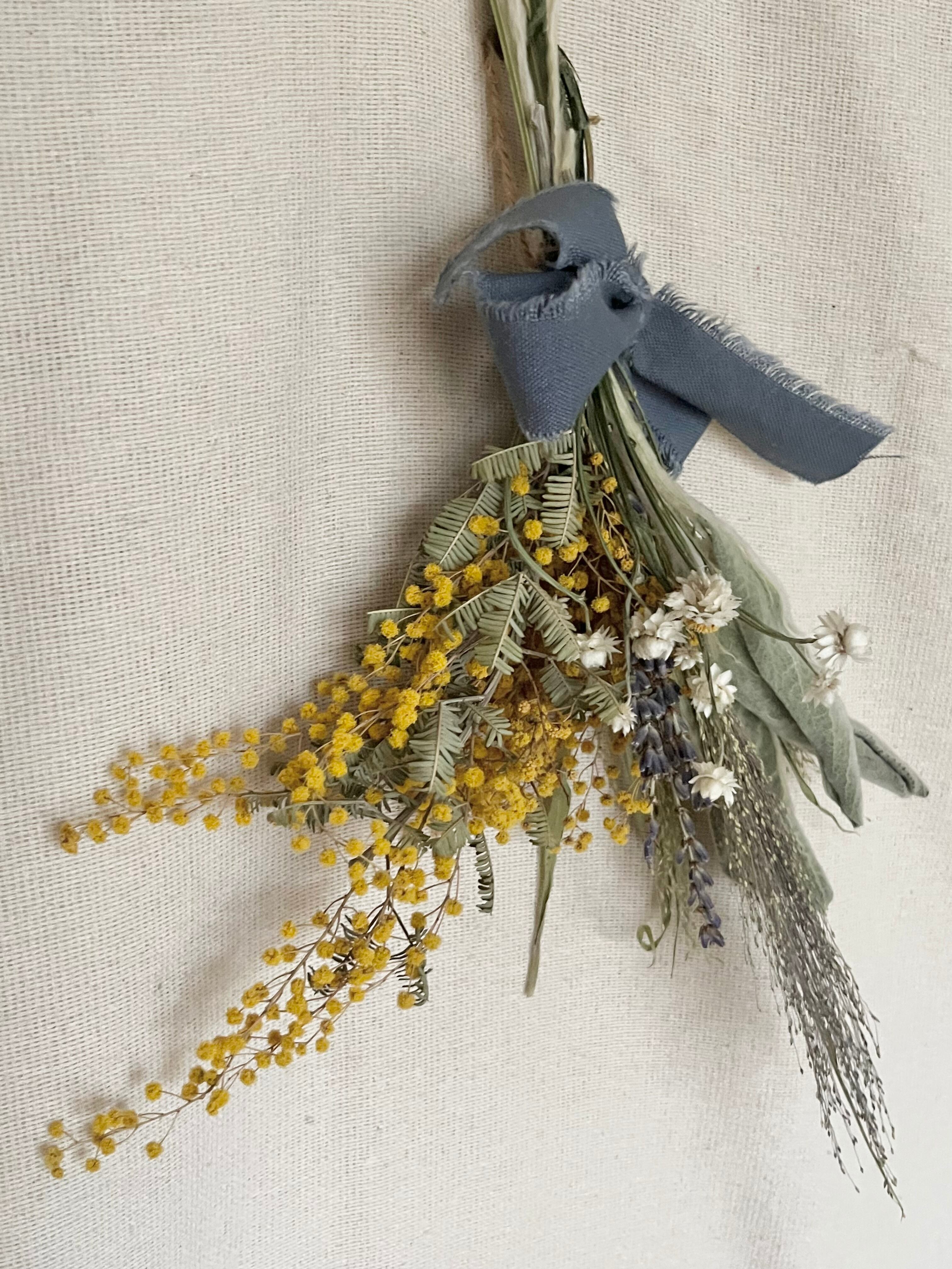 ミモザやスモークグラスなど5種類の花材を使用したミニスワッグ。