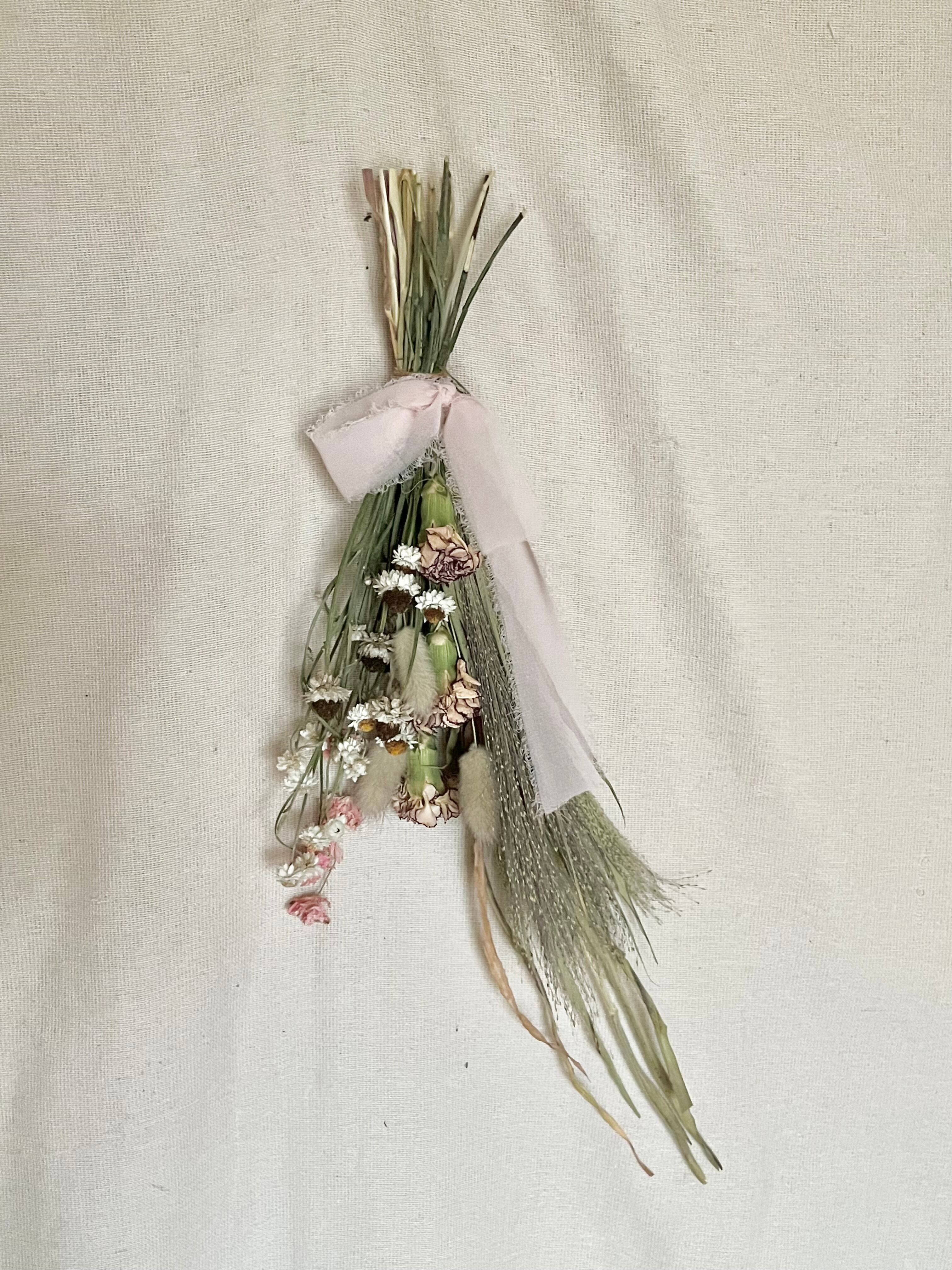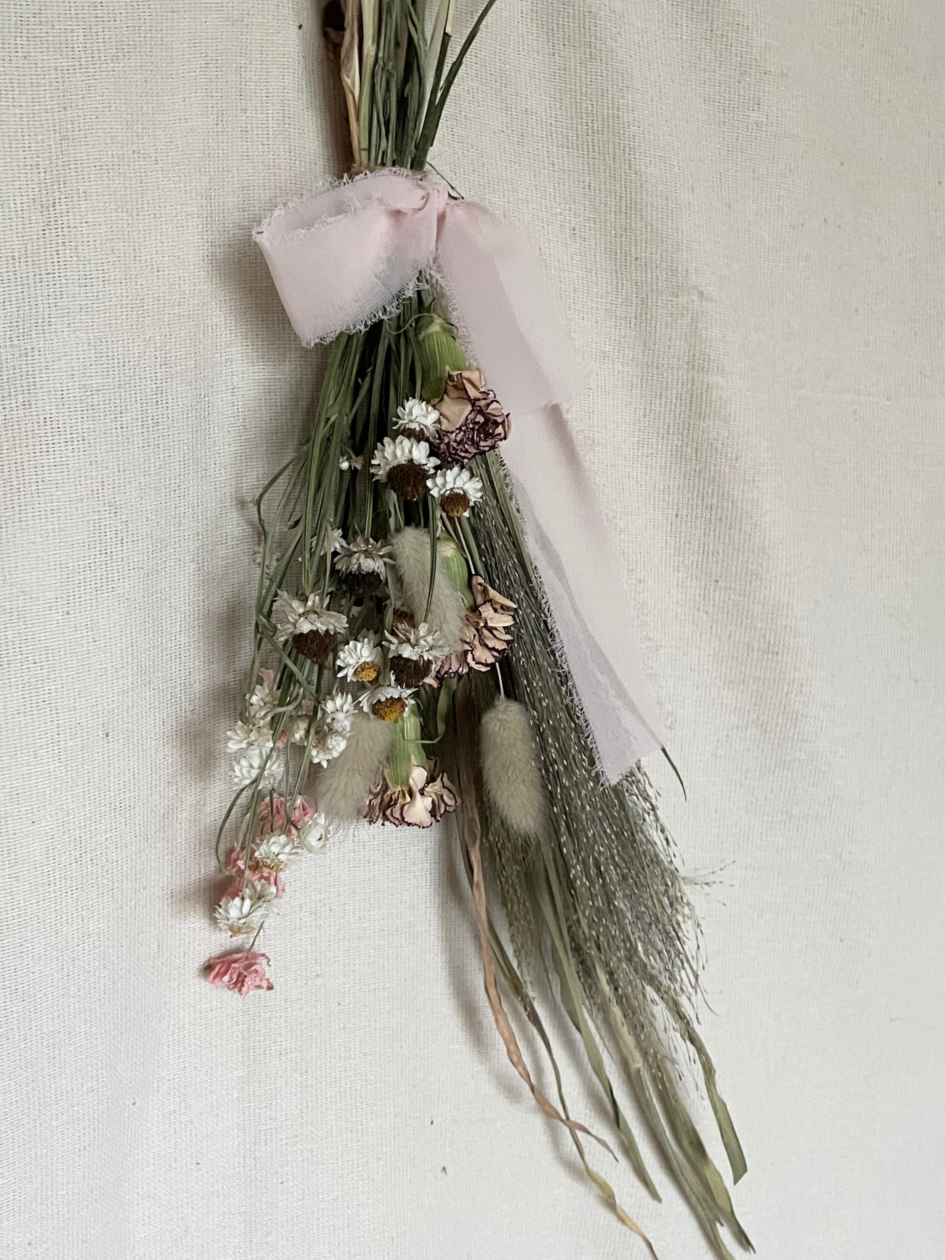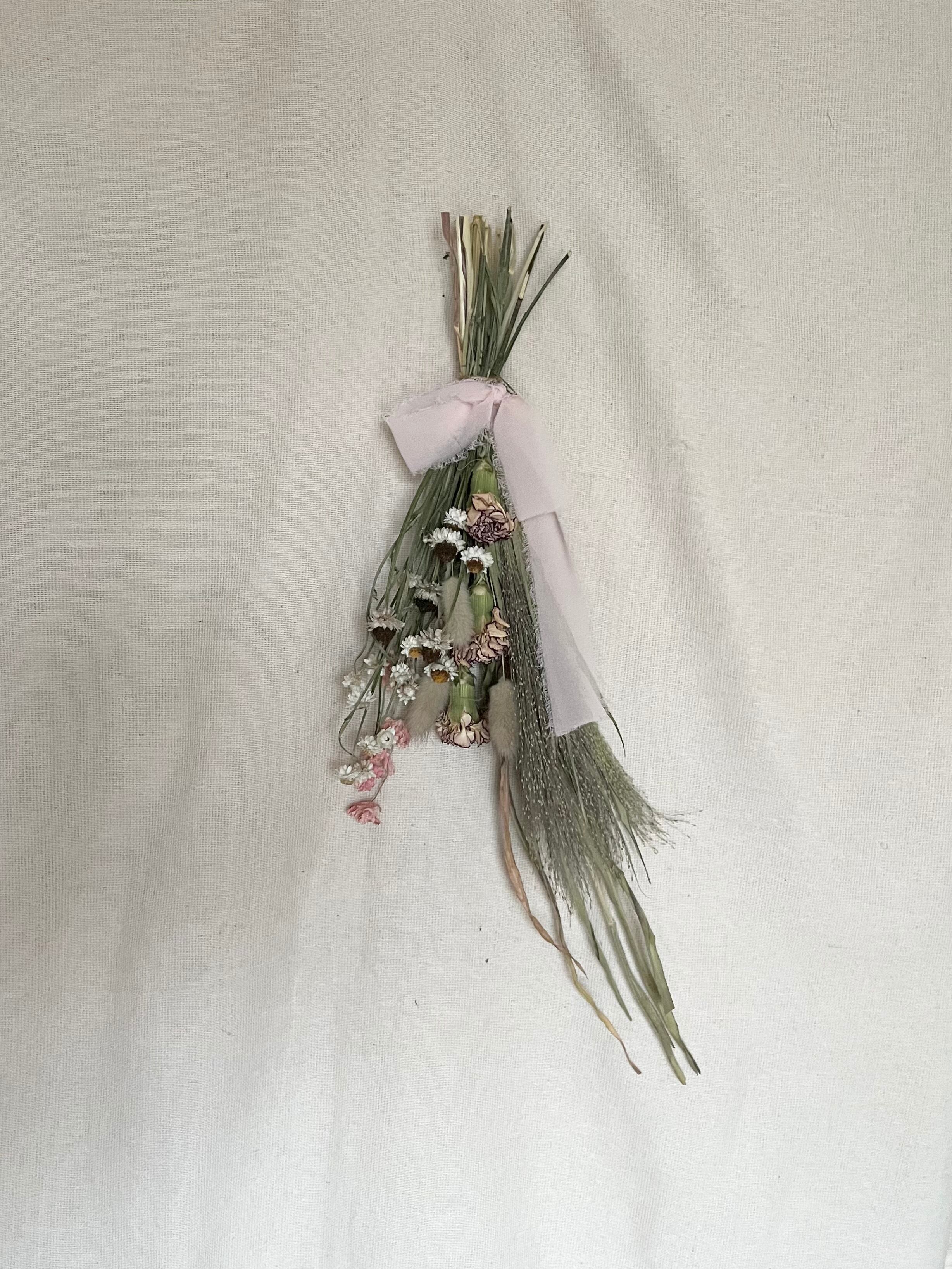 ピンクのカーネーションやデルフィニウムをメインに、スモークグラスやラグラスバニーテールなど、やわらかな5種類の花材で束ねたスワッグ。
