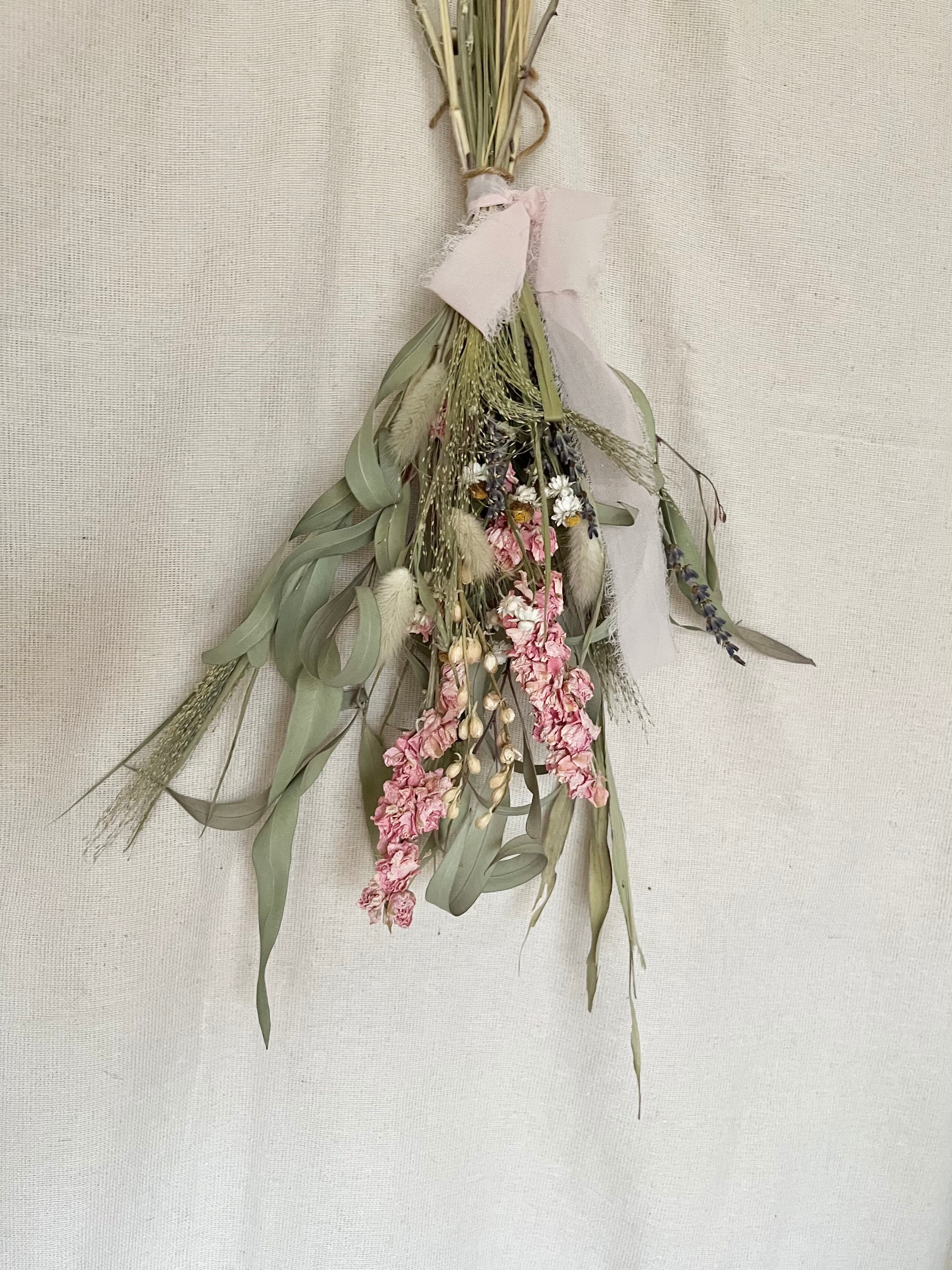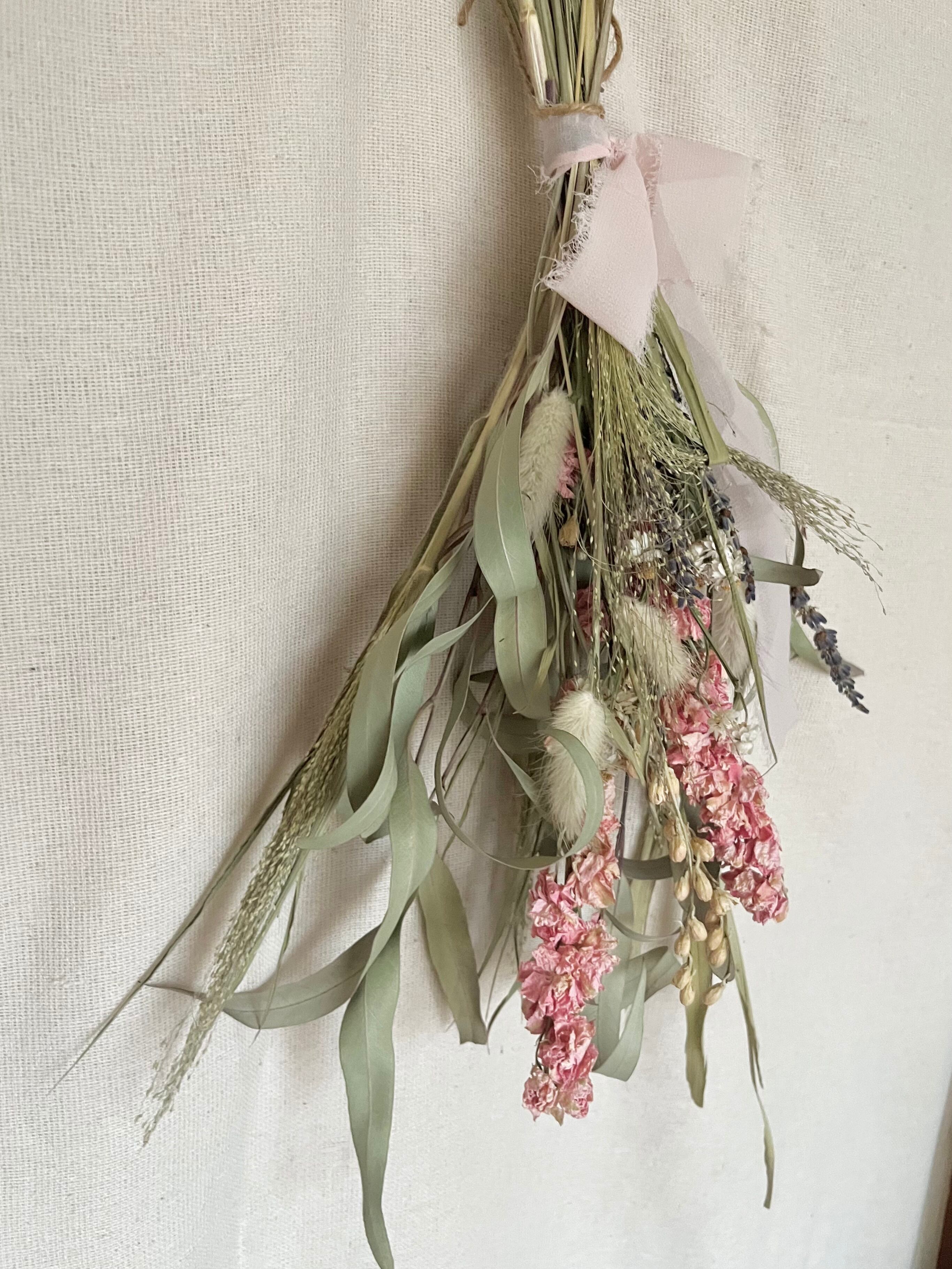 ピンクのデルフィニウムをメインに、ユーカリやカモミール、ラベンダーなどを束ねたシンプルなスワッグ。